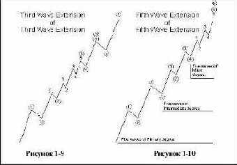 Удлинение также может произойти и внутри другого волнового удлинения. На рынке акций третья подволна удлиненной третьей волны уровнем выше обычно также является удлинением, вычерчивая контур, показанный на рис.1-9. Рис.1-10 иллюстрирует удлинение пятой подволны в уже удлиненной пятой волне уровнем выше. Удлиненные пятые волны довольно редки, за исключением случаев на медвежьем рынке товарной биржи, освещенных в Уроке 29.